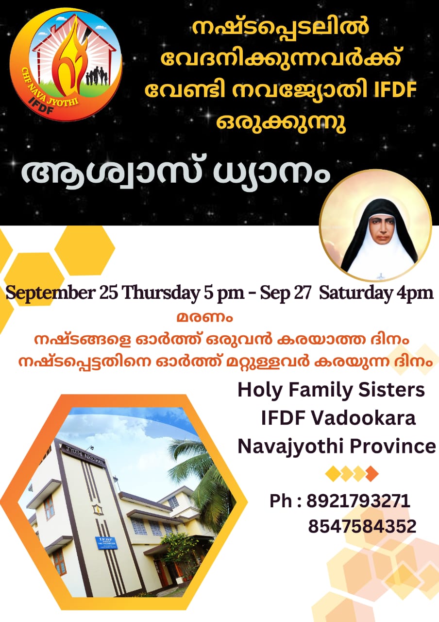 സ്വന്തപ്പെട്ടവർ മരണപ്പെട്ടതിന്റെ വേദനയിൽ കഴിയുന്നവർക്കായി ഒരുക്കുന്ന ആശ്വാസ് ധ്യാന ശുശ്രൂഷ