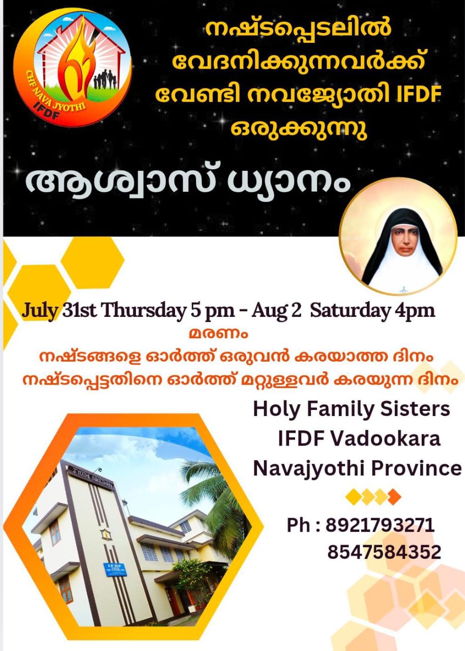സ്വന്തപ്പെട്ടവർ മരണപ്പെട്ടതിന്റെ വേദനയിൽ കഴിയുന്നവർക്കായി ഒരുക്കുന്ന ആശ്വാസ് ധ്യാന ശുശ്രൂഷ ജൂലൈ 31-ാം തിയതി 5.00 pm മുതൽ ഓഗസ്റ്റ് 2-ാം തീയതി 4.00 pm വരെ വടൂക്കര IFDF ൽ വച്ച് നടത്തപ്പെടുന്നു. മരണപ്പെട്ടവർക്ക് വേണ്ടി പ്രത്യേകം പ്രാർത്ഥിക്കാനും, ജീവിതം സ്വയം നവീകരിക്കാനും ഈ ധ്യാന ശുശ്രൂഷ സഹായിക്കുന്നു. ഇതിൽ സംബന്ധിക്കുവാൻ ആഗ്രഹിക്കുന്നവരുടെ പേരുകൾ ജൂലൈ 25-ാം തിയ്യതിക്ക് മുമ്പായി നൽകണേ!