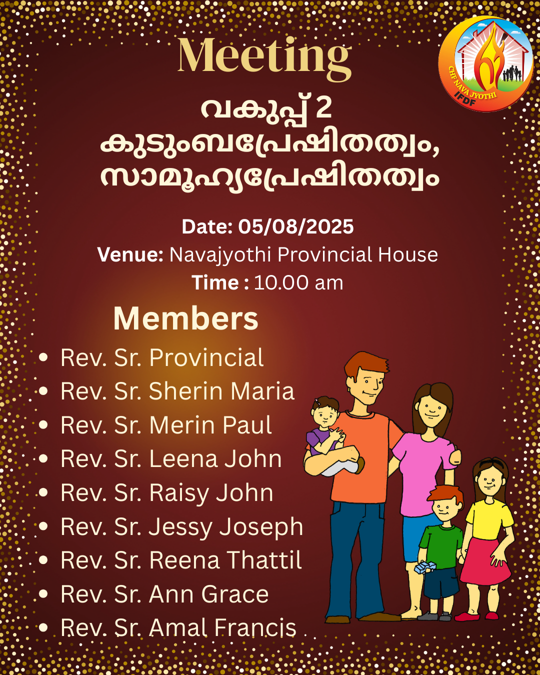 The meeting of the Family Apostolate and Social Apostolate core team members will be held at Navajyothi Provincial House at 10:00 AM.